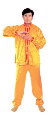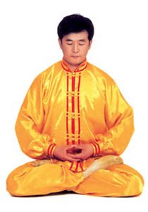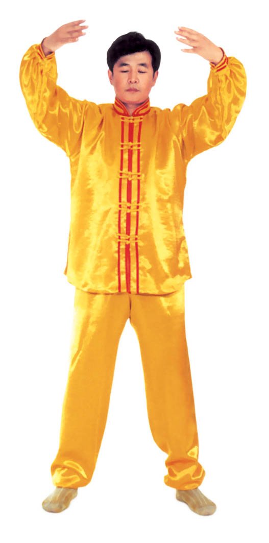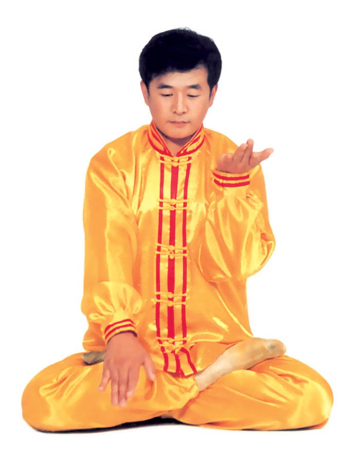 Trước lúc luyện công ý tưởng một chút rằng tự mình [như] là hai thùng rỗng rất cao lớn, sừng sững giữa trời đất, cao lớn không gì sánh được[16]. Khí bên trong [thân] thể thuận theo tay mà [chuyển] động lên xuống, xung lên khỏi đỉnh đầu, trực tiếp tới cực nơi cao nhất của vũ trụ; khí xung xuống sẽ qua từng chân mà xung ra, xung tới cực nơi thấp nhất của vũ trụ. Sau đó khí theo tay mà [chuyển] động, từ hai cực mà quay về trong [thân] thể, rồi lại xuất ra theo hướng ngược lại, lặp lại như thế chín lần. Khi xung quán tới lần thứ chín, thì tay trái (nữ tay phải) ở cực trên mà đợi tay phải (nữ tay trái) đưa lên. Sau đó [hai tay] đồng thời quay về hạ xuống quán nhập vào chỗ cực nơi thấp, [rồi lại] qua thân thể mà xung quán lên, sau khi lặp lại chín lần thì thu khí trở về. Sau khi thu trở lại, thì ở chỗ bụng dưới mà xoay chuyển Pháp Luân theo chiều kim đồng hồ, làm cho khí bên ngoài [thân] thể xoay trở về bên trong [thân] thể, sau đó kết ‘định ấn’[17], luyện công xong thì thu thế chứ không thu công.