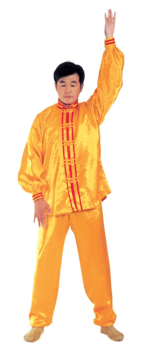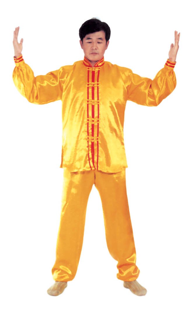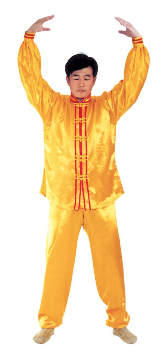 Chưởng chỉ càn khôn[5]: Bắt đầu từ thế “hợp thập”. Hai bàn tay tách ra, cách nhau chừng 2~3cm, đồng thời bắt đầu xoay bàn tay, nam tay trái (nữ tay phải) xoay hướng vào ngực, tay phải hướng ra ngoài ngực, hình thành tay trái ở trên, tay phải ở dưới và cẳng tay giống hình chữ “nhất” (nữ thì trái phải ngược lại), (như hình 1.6) Tiếp theo, cẳng tay trái duỗi thẳng chếch lên bên trái, bàn tay úp xuống, độ cao bàn tay ngang với đầu thì dừng; tay phải đặt chỗ trước ngực, bàn tay ngửa lên. Thuận theo khi tay trái dần dần tới vị trí, thì toàn thân cũng dần dần căng thẳng, đầu dựng lên, chân dẫm xuống. Tay trái duỗi thẳng phía chếch bên trái, tay phải ở trước ngực, bắp tay thẳng hướng phía ngoài (như hình 1.7). Duỗi khoảng 2~3 giây đồng hồ, rồi toàn thân lập tức buông chùng, tay trái lại thu về chỗ trước ngực và cùng với tay phải thành trạng thái “hợp thập”. Sau đó lại xoay bàn tay, triển khai tay phải (nữ tay trái) ở trên, tay trái ở dưới (như hình 1.8). Tay phải lặp lại động tác vừa rồi của tay trái, tức là cẳng tay duỗi chếch sang bên phải, bàn tay úp xuống, bàn tay có độ cao ngang đầu; tay trái vẫn ở chỗ trước ngực, bàn tay ngửa lên. Sau khi duỗi căng xong (như hình 1.9) toàn thân lập tức buông chùng. Thu tay về sau đó hai tay “hợp thập” trước ngực (như hình 1.5)