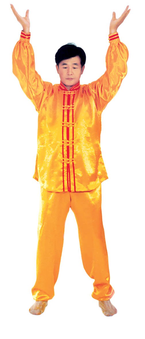 Chưởng chỉ càn khôn[5]: Bắt đầu từ thế “hợp thập”. Hai bàn tay tách ra, cách nhau chừng 2~3cm, đồng thời bắt đầu xoay bàn tay, nam tay trái (nữ tay phải) xoay hướng vào ngực, tay phải hướng ra ngoài ngực, hình thành tay trái ở trên, tay phải ở dưới và cẳng tay giống hình chữ “nhất” (nữ thì trái phải ngược lại), (như hình 1.6) Tiếp theo, cẳng tay trái duỗi thẳng chếch lên bên trái, bàn tay úp xuống, độ cao bàn tay ngang với đầu thì dừng; tay phải đặt chỗ trước ngực, bàn tay ngửa lên. Thuận theo khi tay trái dần dần tới vị trí, thì toàn thân cũng dần dần căng thẳng, đầu dựng lên, chân dẫm xuống. Tay trái duỗi thẳng phía chếch bên trái, tay phải ở trước ngực, bắp tay thẳng hướng phía ngoài (như hình 1.7). Duỗi khoảng 2~3 giây đồng hồ, rồi toàn thân lập tức buông chùng, tay trái lại thu về chỗ trước ngực và cùng với tay phải thành trạng thái “hợp thập”. Sau đó lại xoay bàn tay, triển khai tay phải (nữ tay trái) ở trên, tay trái ở dưới (như hình 1.8). Tay phải lặp lại động tác vừa rồi của tay trái, tức là cẳng tay duỗi chếch sang bên phải, bàn tay úp xuống, bàn tay có độ cao ngang đầu; tay trái vẫn ở chỗ trước ngực, bàn tay ngửa lên. Sau khi duỗi căng xong (như hình 1.9) toàn thân lập tức buông chùng. Thu tay về sau đó hai tay “hợp thập” trước ngực (như hình 1.5)