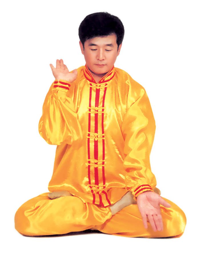 Trước lúc luyện công ý tưởng một chút rằng tự mình [như] là hai thùng rỗng rất cao lớn, sừng sững giữa trời đất, cao lớn không gì sánh được[16]. Khí bên trong [thân] thể thuận theo tay mà [chuyển] động lên xuống, xung lên khỏi đỉnh đầu, trực tiếp tới cực nơi cao nhất của vũ trụ; khí xung xuống sẽ qua từng chân mà xung ra, xung tới cực nơi thấp nhất của vũ trụ. Sau đó khí theo tay mà [chuyển] động, từ hai cực mà quay về trong [thân] thể, rồi lại xuất ra theo hướng ngược lại, lặp lại như thế chín lần. Khi xung quán tới lần thứ chín, thì tay trái (nữ tay phải) ở cực trên mà đợi tay phải (nữ tay trái) đưa lên. Sau đó [hai tay] đồng thời quay về hạ xuống quán nhập vào chỗ cực nơi thấp, [rồi lại] qua thân thể mà xung quán lên, sau khi lặp lại chín lần thì thu khí trở về. Sau khi thu trở lại, thì ở chỗ bụng dưới mà xoay chuyển Pháp Luân theo chiều kim đồng hồ, làm cho khí bên ngoài [thân] thể xoay trở về bên trong [thân] thể, sau đó kết ‘định ấn’[17], luyện công xong thì thu thế chứ không thu công.