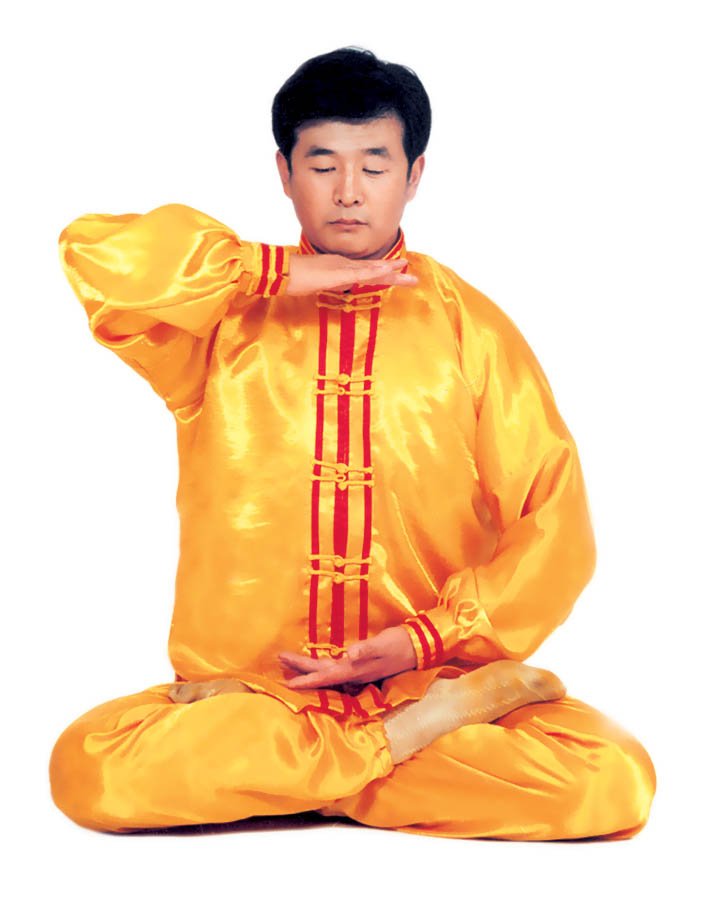 Tu luyện tĩnh công: Tiếp theo tư thế trên, sau đó, tay trên vạch một nửa hình tròn ra phía trước và rơi vào chỗ bụng dưới, hai tay trở thành trạng thái kết ấn (như hình 5.15), tiến nhập vào tu luyện tĩnh công. Nhập định, thời gian càng lâu càng tốt.